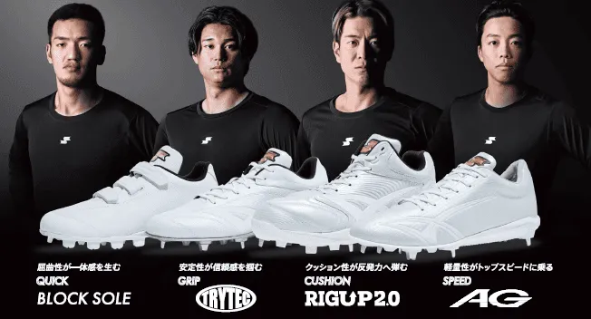 SSKは、選手それぞれのプレースタイルや求める機能に応えるため、スパイクを強化しました。4種類のアウトソールを開発し、4タイプのスパイクを展開。ラインナップは、屈曲性に優れた『BLOCK SOLE(ブロックソール)』、バランス型の『TRYTEC(トライテック)』、クッション性を追求した『RIGUP2.0(リグアップ2.0)』、軽さに特化した『AG(エージー)』の4種類で、あらゆる選手を足元から支えます。