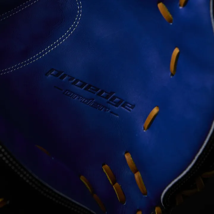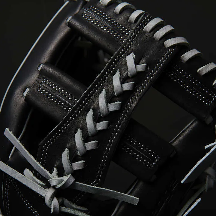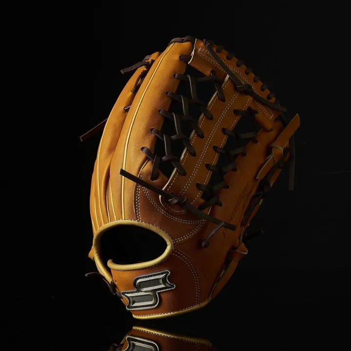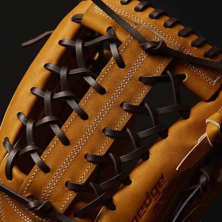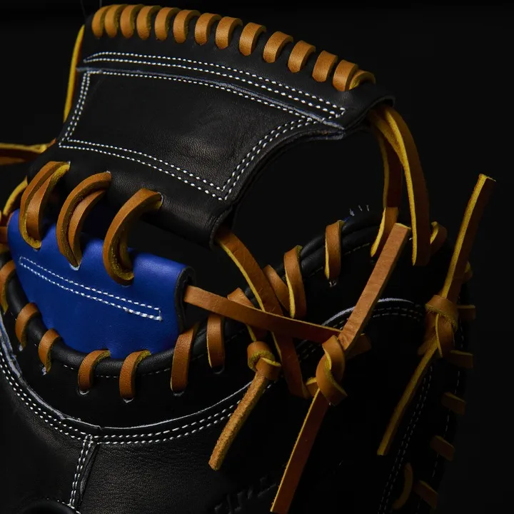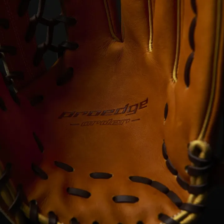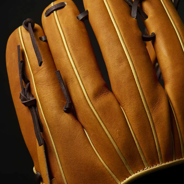 落ち着いたMブラウンにゴールドを合わせることで、渋さの中に華やかさがあるカラーリングに。ポケットが深めの874型を採用。「手を下げたときに、意識して捻らなくても面が打球を向く」という本人のこだわりを形にしました。
