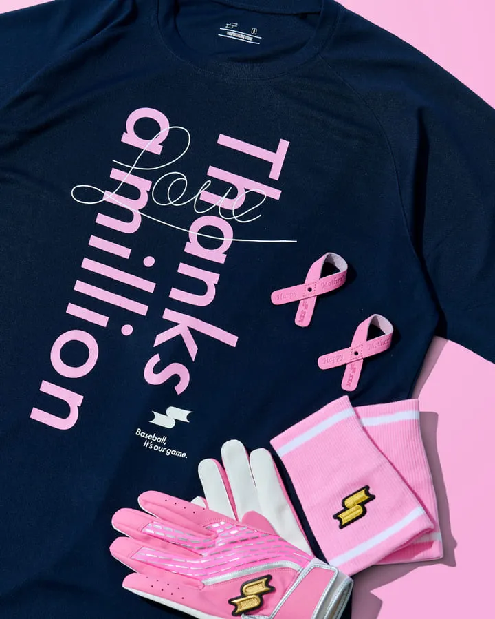 ネイビーを基調とし、前面に「Thanks a million(本当にありがとう)」を淡いピンクでデザインした感謝を伝える特別なTシャツです。ジュニアサイズから大人サイズまで展開し、チームでおそろいにしたり、お母さんへのプレゼントにおすすめの一着です。SSK公式オンラインショップ限定で、324日(火)から331日(火)まで予約を受け付けます。