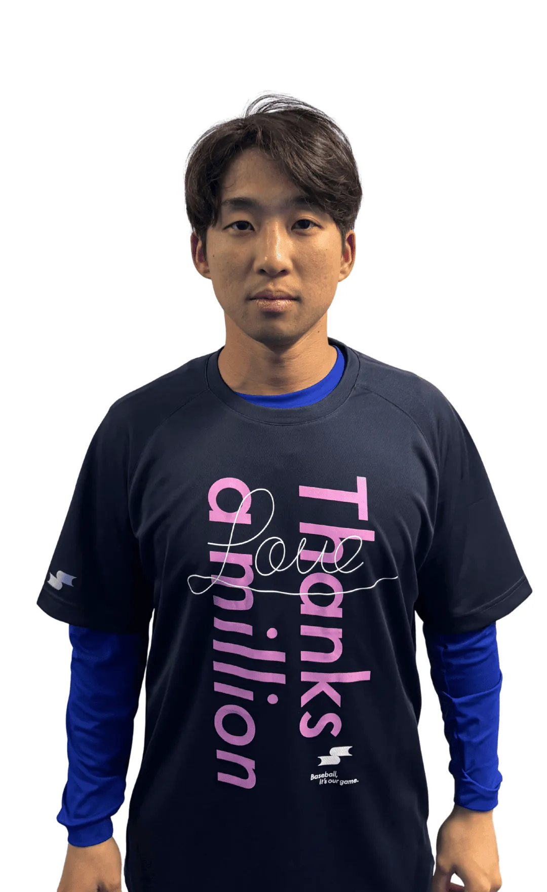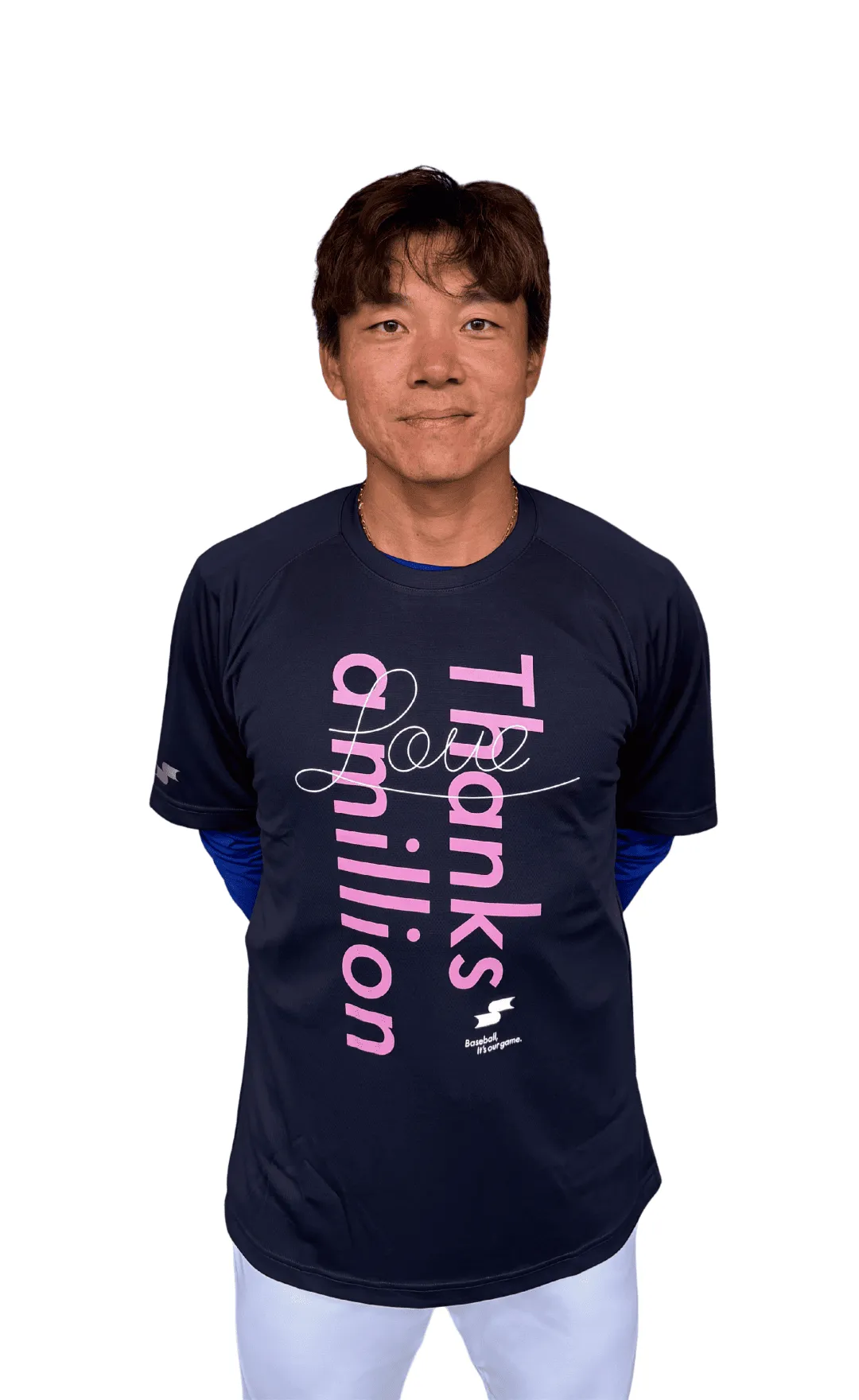 ネイビーを基調とし、前面に「Thanks a million(本当にありがとう)」を淡いピンクでデザインした感謝を伝える特別なTシャツです。ジュニアサイズから大人サイズまで展開し、チームでおそろいにしたり、お母さんへのプレゼントにおすすめの一着です。ご好評につき、予約販売期間を4/10まで延長し、お届けは5月初旬予定です。