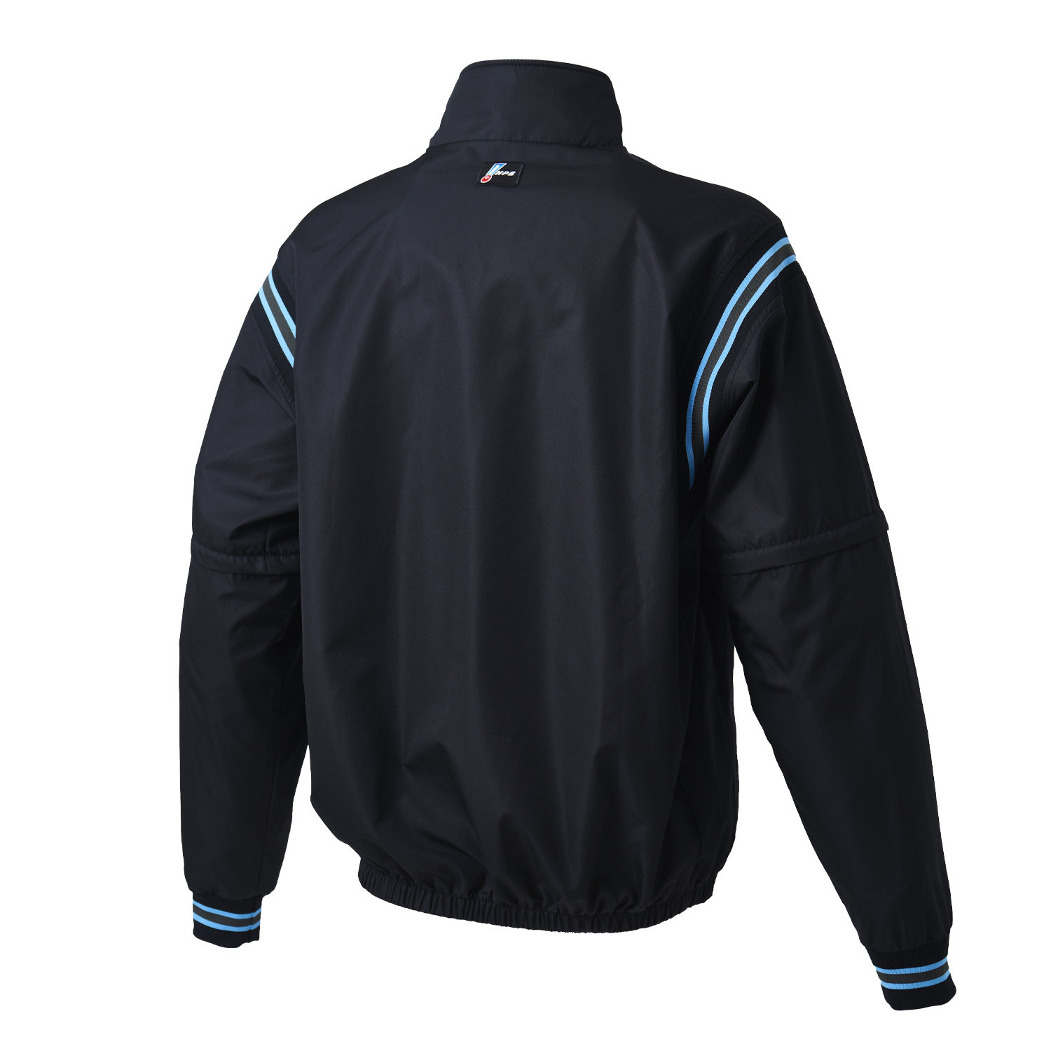 胸と後襟下に刺繡ワッペンのNPBマークが付いたオフィシャルウェアで、オープン戦やシーズン始まりの時期にNPB審判員が着用している2WAYジャケット。
